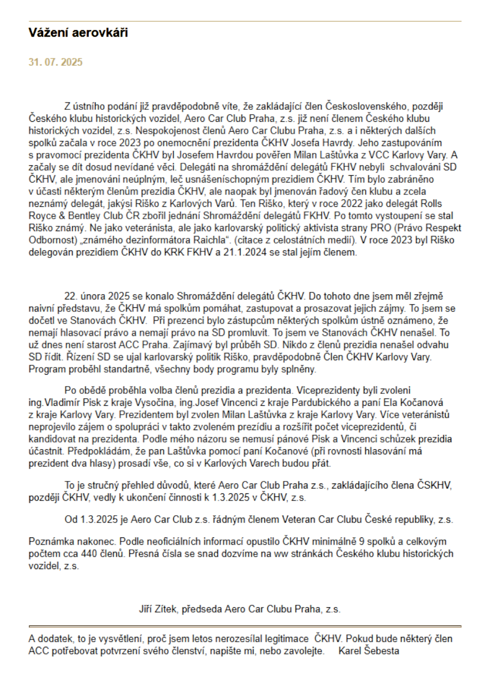 Z ústního podání již pravděpodobně víte, že zakládající člen Československého, později Českého klubu historických vozidel, Aero Car Club Praha, z.s. již není členem Českého klubu historických vozidel, z.s. Nespokojenost členů Aero Car Clubu Praha, z.s. a i některých dalších spolků začala v roce 2023 po onemocnění prezidenta ČKHV Josefa Havrdy. Jeho zastupováním s pravomocí prezidenta ČKHV byl Josefem Havrdou pověřen Milan Laštůvka z VCC Karlovy Vary. A začaly se dít dosud nevídané věci. Delegáti na shromáždění delegátů FKHV nebyli schvalováni SD ČKHV, ale jmenováni neúplným, leč usnášeníschopným prezidiem ČKHV. Tím bylo zabráněno v účasti některým členům prezidia ČKHV, ale naopak byl jmenován řadový čen klubu a zcela neznámý delegát, jakýsi Riško z Karlových Varů. Ten Riško, který v roce 2022 jako delegát Rolls Royce & Bentley Club ČR zbořil jednání Shromáždění delegátů FKHV. Po tomto vystoupení se stal Riško známý. Ne jako veteránista, ale jako karlovarský politický aktivista strany PRO (Právo Respekt Odbornost) „známého dezinformátora Raichla“. (citace z celostátních medií). V roce 2023 byl Riško delegován prezidiem ČKHV do KRK FKHV a 21.1.2024 se stal jejím členem.